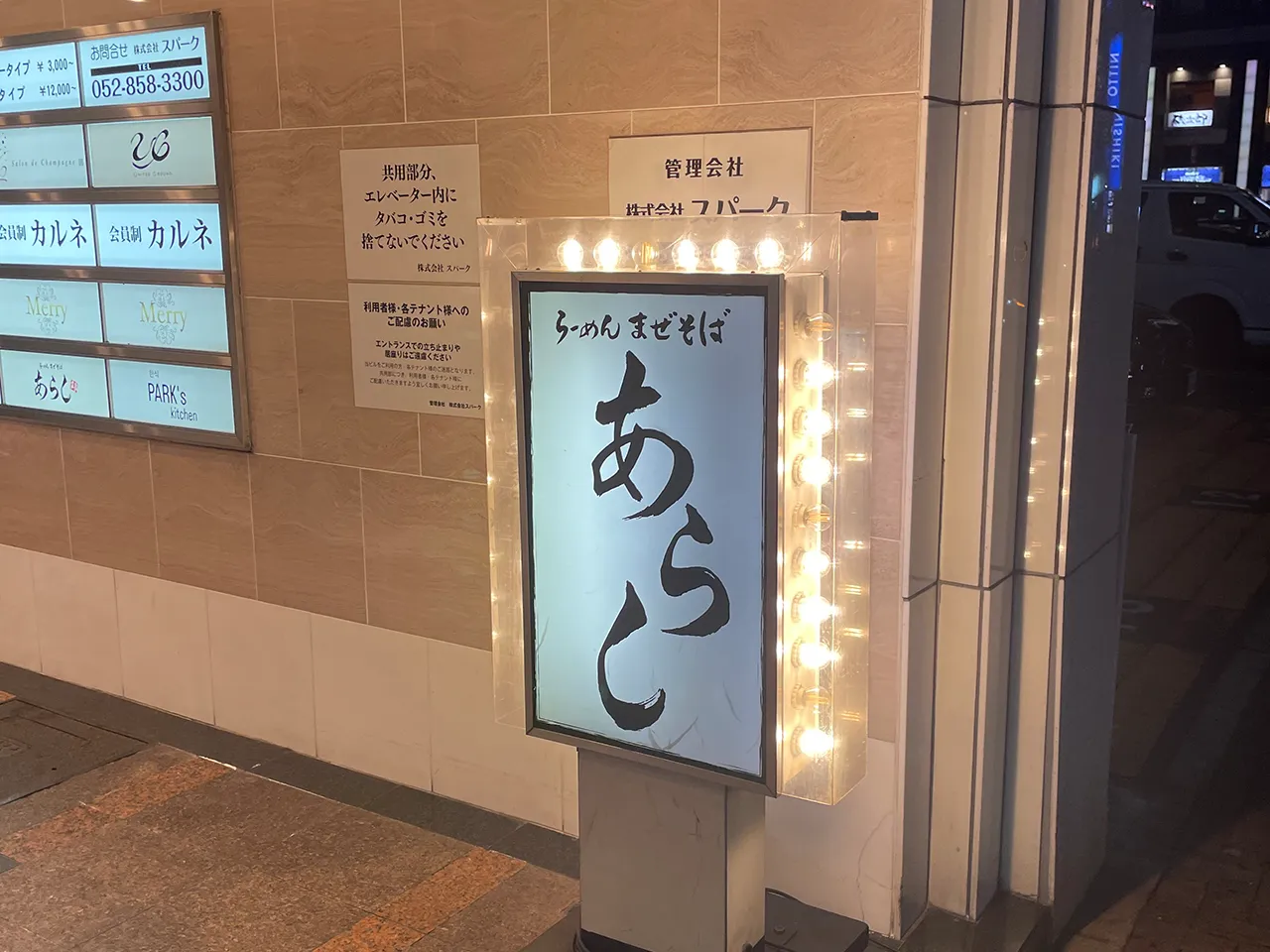 らーめんまぜそば あらしは、錦という名古屋の夜の中心街の一角にあります。
