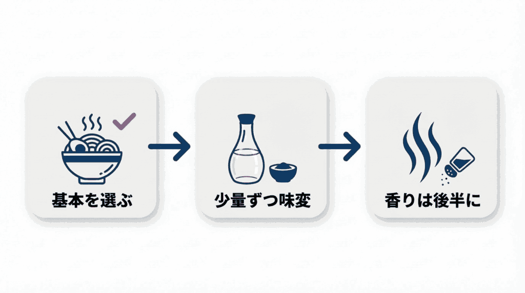 - 味はまず“素”で一口 → その後に軽さを足す(いきなり味変しすぎない)
