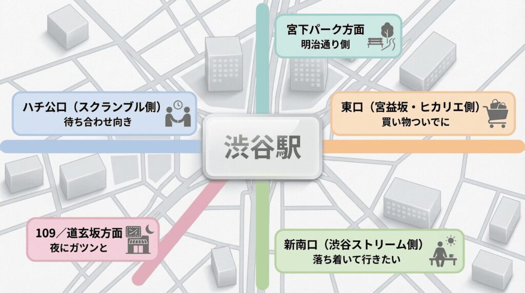 渋谷での迷いは、味よりも「どっちの出口(方面)に出るか」で増えます。